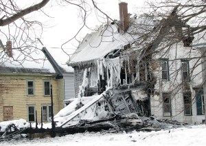 Ice-covered debris and charred embers are all that is left of the rear portion of Daniel and Charlotte Louvat’s house at 41 Weld St. and The Cutter’s House, Charlotte’s hair and tanning salon business. The building caught fire early Friday afternoon in Dixfield.