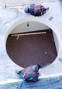 Workers prepare the area where one of three 8,000-gallon fermentors will sit at Baxter Brewing in Lewiston on Tuesday.