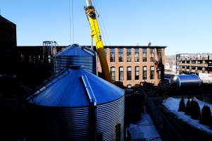 One of three 240-barrel fermenters is lifted from a truck by a crane from Cote Crane & Rigging at Baxter Brewing in Lewiston on Tuesday. The fermenters were put in place, finishing a yearlong, $2 million expansion. The three 8,000-gallon fermenters will allow the company to brew 24 hours a day, a process that will help fill demand. Only about 30 percent of orders were filled in 2012, said company founder Luke Livingston.