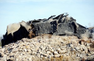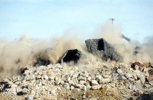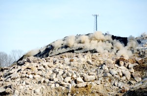 A blast occurs beneath the rubber blasting mats near Maine Turnpike Exit 80 in Lewiston on Friday.