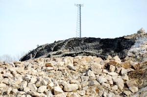 Rubber blasting mats cover an area near Maine Turnpike Exit 80 in Lewiston prior to being blasted Friday.