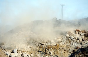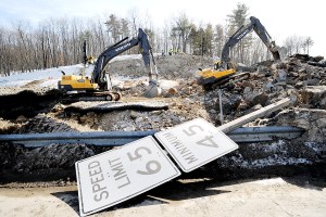 Workers from R.J. Grondin & Sons of Gorham and Maine Drilling & Blasting of Gardiner clear the area near Maine Turnpike Exit 80 in Lewiston following a blast Friday. Blasting operations have occurred up to two times a day since the beginning of February as part of replacing the Exit 80 interchange and both bridges that carry turnpike traffic over Alfred Plourde Parkway. Construction will be completed in three phases over the course of three years.