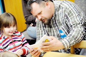 Steve Martel of Greene looks through his daughter’s book during a book-building workshop at the Lewiston Public Library on Saturday. Abby Martel, 4, created a book about zoo animals during the event. Thirteen volunteers from SPi Global helped children write and illustrate their own books. Martel works for SPi Global, a composition house in Lewiston.