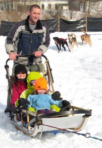 Riders Angie Casavant and her daughters, Emma, 8, and Allison, 6, all of Farmington, broke out into big grins and laughter as dog sled driver Jake Turner of Jay started his dog team on the trail.