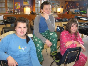 Spruce Mountain Middle School is celebrating Spirit Week this week. On Monday, youngsters and some teachers came to school in their pajamas. Sixth-graders Caitlin Tibbetts, Thomas Hebert and Olivia Grant were among them. On Tuesday, students will come dressed as a teacher, Mr. Hartford, who always wears wild shirts and ties. Wednesday is Crazy Hair Day; Thursday calls for wearing the Phoenix colors of black and green; and Friday will end with a series of relay races.