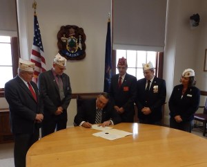 Members of the American Legion recently visited the Governor’s office in Augusta to witness the signing of the Proclamation for “American Legion Day.” This proclamation was created in honor of the American Legion’s anniversary, which takes place Saturday, March 15, when it will turn 95 years old. Pictured from left to right are Department of Maine 2nd Vice Commander Ronald Rainfrette, Department of Maine Commander John Hargreaves, Governor Paul LePage, NEC/Department Adjutant Paul L’Heureux, Department Service Officer Amedeo Lauria and Department of Maine Chaplain/Post 24 Commander Tricia Thurston.