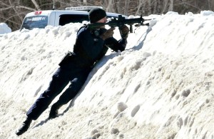 Trooper Scott Duff trains his rifle toward the home of Michael Smith in Norridgewock on Tuesday. Officers descended on Smith’s home after members of a tree removal crew he’d told to clear off his property reported that he had a gun. The “gun” the tree crew had seen on Smith actually was a life-sized tattoo of a handgun on his stomach.