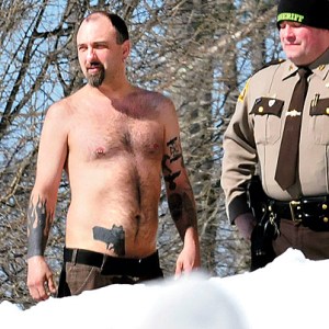 In this Tuesday, March 18, 2014 photo, Michael Smith, left, stands beside a Somerset County Sheriff deputy outside his home in Norridgewock, Maine. Officers armed with assault rifles descended on Smith’s home after members of a tree removal crew he’d told to clear off his property reported that he had a gun. The “gun” the tree crew had seen on Smith actually was a life-sized tattoo of a handgun on his stomach. (AP Photo/Morning Sentinel, David Leaming)