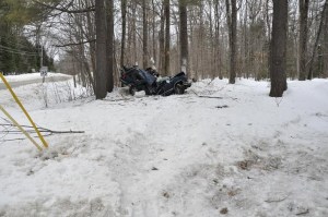 The SUV struck a snowbank and went airborne before hitting a rock wall. It continued rolling onto the driver’s side and struck a tree with its roof.