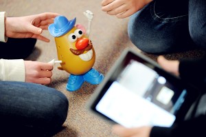 McKenna Casey, Alec Larson and Maddie Landry use an iPad to film a one-minute commercial on Mr. Potato Head during CyberDay at Auburn Middle School on Friday.