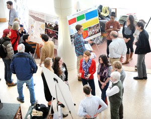 Bates College sophomore John Allard, back center with plaid shirt, talks about his project at the 13th annual Mount David Summit in Pettengill Hall at the Lewiston campus. More than 300 students presented more than 100 research posters in African studies, biochemistry, biology, chemistry, economics, environmental studies, geology, history, mathematics, neuroscience, physics and psychology. Topics ranged from the economics of the Maine rockweed harvest to treatments for tuberculosis, and from the Arab Spring to the impact of algae blooms in Lake Auburn.