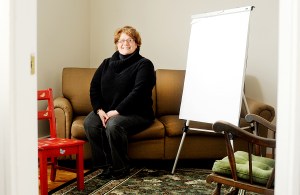 Her interview space is a small, den-like room in a white colonial. The room has a brown couch, a paper easel, a box of tissues and a rocking chair — for Myrick.