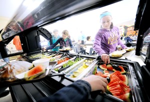 School lunches include a salad bar, fresh fruit and vegetables. French fries are baked, breads and pizza crusts are made from whole grains, salt content of food is low and cheeses are low-fat.