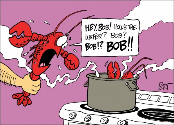 His cartoon “How’s the water, Bob?” depicting a frantic lobster headed for the stockpot, was among his most popular sketches.