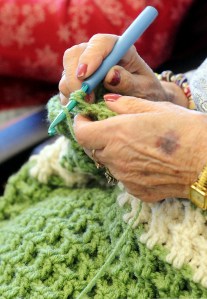 They work on whatever project they want. Some make “grumpy dolls,” a squishy stress doll that can be squeezed as hard as needed. Others make lap robes, hats and shawls.