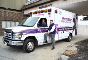 Franklin Memorial Hospital recently unveiled a specially painted NorthStar ambulance reflecting the organization’s commitment to increase awareness of domestic violence. Lee Ireland, NorthStar regional operations manager, and Gerald Cayer, Franklin Community Health Network executive vice president, are with the vehicle. Featured prominently on the ambulance is the message, “There are no excuses, period!” along with the area’s domestic violence helpline number and a link to view a video developed by staff at Franklin Memorial Hospital called “Break the Chain” Purple Glove Dance. The ambulance will dispatch out of all five NorthStar bases: Farmington, Carrabassett Valley, Livermore, Phillips and Rangeley. It is expected to travel as far north as Fort Kent and as far south as Boston and make special appearances at community parades, festivals and fairs.