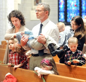 Mike Tyne and his wife, Diane, keep their 2-year-old son, Matthew, occupied as Palm Sunday Mass winds down at the Basilica of Saints Peter and Paul in Lewiston. Two of their other children, James, 4, left, and Joan, 6, right, accompany their parents who drove from Sumner to take part in one of the most highly attended Masses of the year.