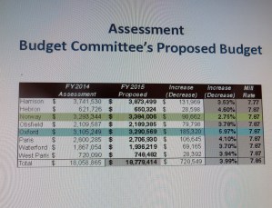 During the nearly 90-minute presentation at the Guy E. Rowe School for officials and residents in Norway and Paris, Colpitts said the budget, which is 4.75 percent more than this fiscal year, requires an average 3.99 percent increase in local assessments. It puts the emphasis on instruction and programs, he said.