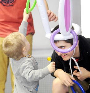 Jacob Lawler, 3, and Zach Danse, 16, both of Auburn, play “bunny ears” during the City of Auburn Spring Celebration at the Hasty Community Center on Saturday. Danse, a sophomore at Edward Little High School, was one of the volunteers who helped with games such as the egg toss, bunny hop and stick the tail on the bunny.