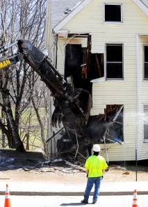 A vacant apartment building at 9 Gamage Ave. in Auburn is demolished by Roland Chabot on Friday. The building was damaged by fire in January 2013. Neighbors in the adjacent apartment building said they have been waiting for the structure to come down and had watched copper thieves and squatters come and go.