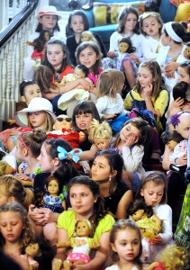 All of the girls at the the Woman’s Literary Union of Androscoggin County’s 2014 Annual Round the World Doll Tea Sunday session four gather on the stairs of the Foss Mansion in Auburn on Sunday.