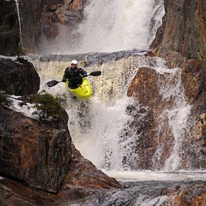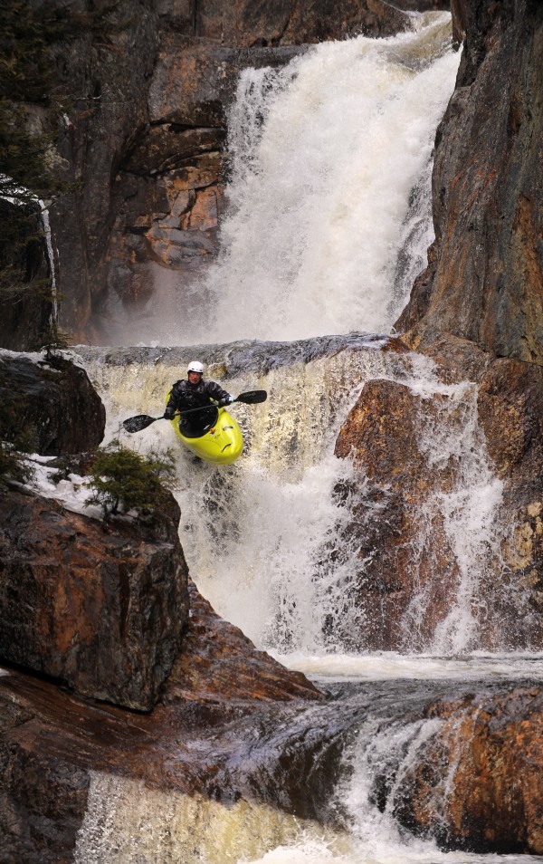 Jeremy Cass runs the 20-foot-high drop at Smalls Falls on the Sandy River during the Smalls to the Wall steep creek kayak race in Township E on Saturday, April 19. The race course was only about 1/8th of a mile long, competititors had to negotiate five of the six waterfalls dropping about 60 vertical feet between the start and finish.