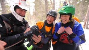 Mike McVey (left), Jane Koopman (center), and Margaret Williams share a laugh as they look at photograps taken during the runs of Smalls to the Wall steep creek kayak race on the Sandy River in Township E. Koopman and Williams were the the only women in the field of 11 competitors in the race.