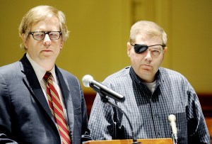 Callahan sat staring at the table in front of him, his hands folded in his lap as he listened. He walks with a cane and takes a dozen pills a day to treat symptoms of multiple sclerosis, a thyroid condition, anxiety and depression, among other ailments.