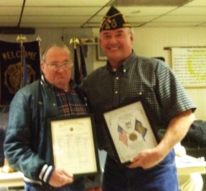 At a recent general membership meeting of the William J. Rogers Post 153, American Legion, Commander Paul R. Bernard, at right, was honored to present Dana Brooks, left, past post commander, with a 50-year certificate from John Hargreaves, commander of the American Legion Department of Maine, and from Daniel M. Dellinger, national commander of the American Legion. Brooks has been a member of the American Legion for 50 years, serving the community, state and nation. A cake, featuring an American flag made of frosting, was specially designed by Brooks’ daughter-in-law, Dyen Brooks.