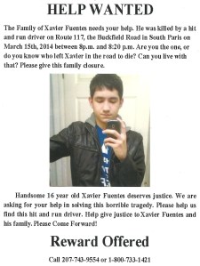 Xavier Fuentes’ body was found by a passing motorist on an unlit stretch of Route 117 in Paris sometime before 8:30 p.m. on March 15. He had attended a movie at Flagship Cinema in Oxford with family members earlier in the evening but left and began walking to his grandparents’ home in Turner when he was hit, police have said.