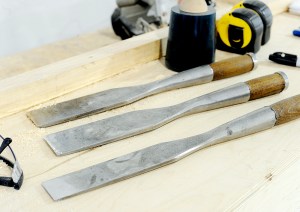 On Thursday, Jon Santiago of Kingfield and Eric Meyer of Farmington used electric chain-mortisers to rough out the mortises in timbers to take out the bulk of the wood. They planned to use a chisel to square off the cavity.