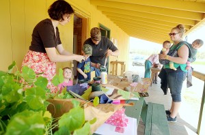Rebecca Trujillo, left, of Leeds and her 2-year-old daughter, Annie, decorate a flower pot for Mother’s Day at the River Rise Farm in Turner on Sunday. The farm was one of six businesses in Turner and Livermore to participate in Farmanalia, a celebration of Mother’s Day while sharing the strength and soul of local farms and artisans. Rebecca Mitchell, right, of Lewiston spent the day with her 1-year-old twins, Madelynne, front, and Lilliana, back, while Jon Hutchinson of Carthage and his 2-year-old son, Blake, decorate a pot for Blake’s mother, Rebecca Hutchinson.