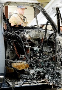 Lewiston Fire Department Acting Lt. Roger Roy frowns over the blackened ruins of a pickup truck that burned Wednesday morning. The truck parked at 740 Thompson St. was fully engulfed when firefighters arrived at the scene. Nobody was hurt in the blaze, but the pickup was destroyed. Lewiston fire Investigator Paul Ouellette said a mechanical malfunction was the cause. The truck owner had run out of gas the night before, Ouellette said. The owner added gas Wednesday morning and when he tried to start it, there were “popping sounds” from beneath the hood. The owner walked down the street to fetch his mechanic and when the two men arrived back at the scene, the truck was in flames.