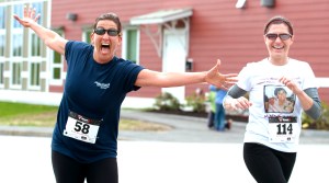 Lisa Hallee, left, of Portland, and Amy Sylvia of Gorham laugh and goof off as they run the Androscoggin Hospice House 5K and Remembrance Walk in Auburn on Sunday.