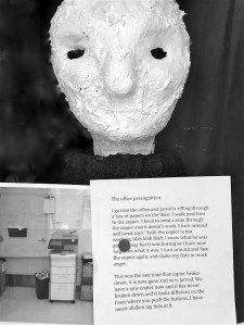 His uncle pulling up in a new Ford Thunderbird. The copier breaking down at work.