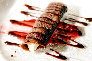 Lewiston’s Rolly’s Diner, a breakfast and lunch landmark, provided the second of the evening’s two dessert offerings. Sadie Blais of Rolly’s prepared her signature Sadie crepe. “It’s a chocolate crepe,” explained Blais, “filled with a mocha-flavored mousse and served with a dab of raspberry and a drizzle of chocolate.” This decadent treat has won multiple awards at local chocolate competitions.