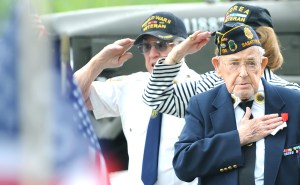 Harry W. Dixon Jr., who served in the U.S. Army in Europe during WWII, says the Pledge of Allegiance with other veterans during Monday’s Memorial Day service in Sabattus following their parade. To watch a video, visit sunjournal.com.