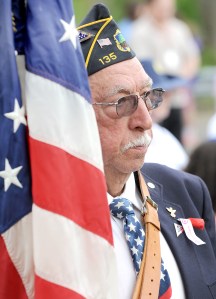 Don Gosselin of Lewiston, a member of the American Legion Post 135 in Sabattus listens to speakers during Monday’s Memorial Day ceremonies in the town square.