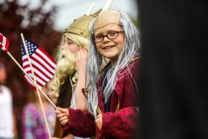 Emma Chapman, 5, wears an American bald eagle costume in the West Paris Memorial Day service on Monday. She and 13 other members of the West Paris Explorers Drama Club, an after-school program, were dressed as characters from the nation’s history. Their costumes were made by leader Eileen Storck.