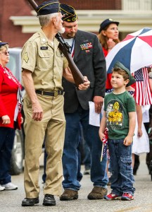 Sawyer Coffin looks up at Lloyd Record, a member of the honor guard in the West Paris Memorial Day parade Monday. Sawyer stands next to his father, Shawn Coffin, commander of the Ring-McKeen Post 151 of the American Legion of West Paris.