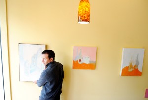 Josh Vink, executive director for L/A Arts, hangs oil-on-canvas paintings by Jake Paris at The Cupcakery on Lisbon Street in Lewiston on Wednesday. Vink and Penny Drumm are putting the final touches on the 10 art venues that L/A Arts is curating for the Art Walk Lewiston Auburn, which is being held from 5 to 8:30 p.m. Friday, May 30. Artwork will be on display at 22 locations along Lisbon Street during the first of five art walks being held this summer.