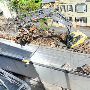 Brian Dubois from Monin Excavating loads debris from 21 and 23 Howe St., in Lewiston Thursday moring from the apartment buildings that were destroyed by fire on April 10th, leaving about 20 people homeless. According to Bill Bennett from Pine Tree Waste, the city of Lewiston hired his company to truck the fire damaged debris to the Juniper Ridge Land Fill in Old Town. They should be finished by this weekend.