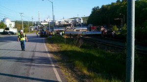 The H.O. Bouchard tanker was taking slurry into the plant from Searsport at the plant’s north gate entrance as the Pan Am train was apparently pulling away. As it was being pushed, the tanker hit a stub from an old utility pole and rolled over, Cohen said.