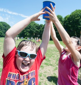 Washburn Elementary School third-grader Bryce Holt-Giard passes a cup filled with water to second-grader Elizabeth Gove during a “bucket brigade,” one of many games being played during Monday’s Field Day held at the PAL center in Auburn.