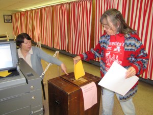 Voting was steady Tuesday morning at the Wilton Town Office, according to ballot clerks. Angela Werner, left, shows resident Barbara Holt where to put a ballot. Residents were voting on the RSU 9 school budget, a three-candidate race for one selectman’s seat, an unopposed run for another board seat and a school board director position.