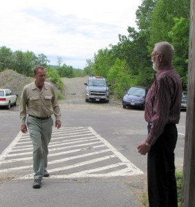 Wilton Selectman candidate Gerald Whitney, right, greets Peter Marble as he enters the Wilton Town Office to vote Tuesday morning. Voting was steady throughout the morning, according to ballot clerks.