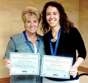 The team of Sound Physicians hospitalists at St. Mary’s Regional Medical Center in Lewiston have been recognized for providing exceptional clinical care and patient experience to patients. At their recent annual meeting, Sound Physicians presented St. Mary’s hospitalists awards for the Highest Performing Hospital in the Atlantic Region and the Most Improved Hospitalist Team in the Atlantic Region. These awards were based upon performance on a number of quality/safety outcome measures from core measures performance, length of stay and patient experience scores. Accepting the awards were chief hospitalist Dr. Amber Pena, right, and Karen Richardson, hospitalist RN, left.