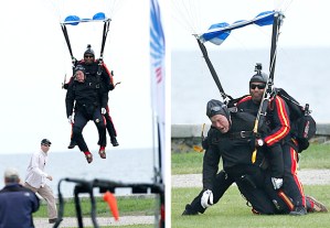 Bush later floated to the ground using a red, white and blue parachute and landed near St. Ann’s Church, where friends and family had gathered, out of the sight of reporters. Elliott said Bush’s foot got tangled up underneath him during the landing, causing him to tumble forward onto the ground. A spokesman later said the former president was feeling “fine.”