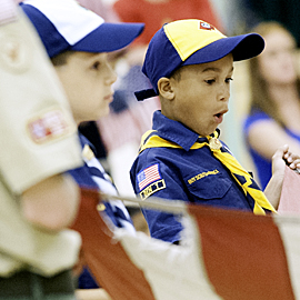 Domante Powell, 8, a second-grader at Farwell Elementary School, reacts after counting the stars and stripes on a flag to be retired during a flag retirement ceremony at the school Thursday. “We will now have a new flag to fly over our school as a symbol of loyalty and faith that we have in the United States of America,” Principal Althea Walker said.