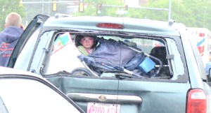 Madison Gallant, 4, looks out the back of the van she was riding in when it was rear-ended on Longley Memorial Bridge in Lewiston on Friday afternoon. Her sister Emma, 8, was taken to the hospital when the stroller in the back hit her in the head. Four people were taken to the hospital with nonlife-threatening injuries in the three-vehicle accident.